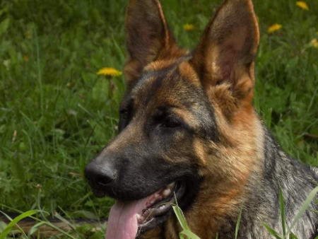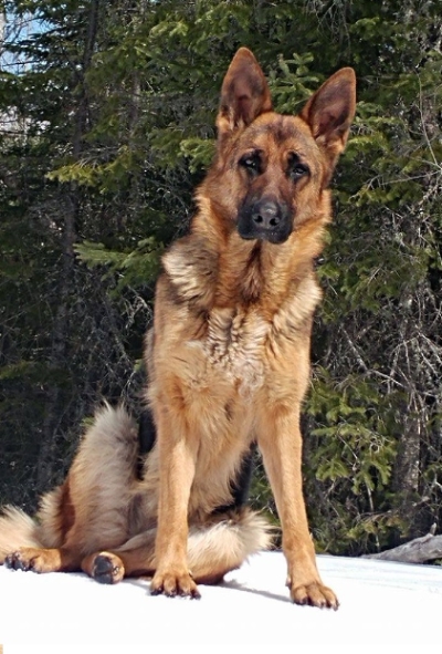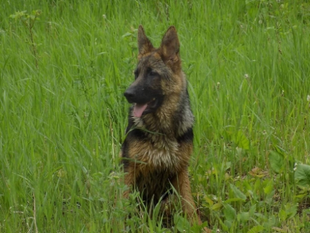 DOB : This girl is a beautiful mixture of both parents. Fantastic drive, striking looks, friendly happy girl. She is large female with good structure, clear head and great working drive. She has the looks and the drive to do whatever I have planned for the future. I look forward to using her in my breeding program and expect great things from her.